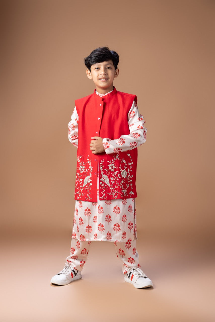 Red Peacock And Flower Zari Embroidery Top With Flower Printed Cord Set
