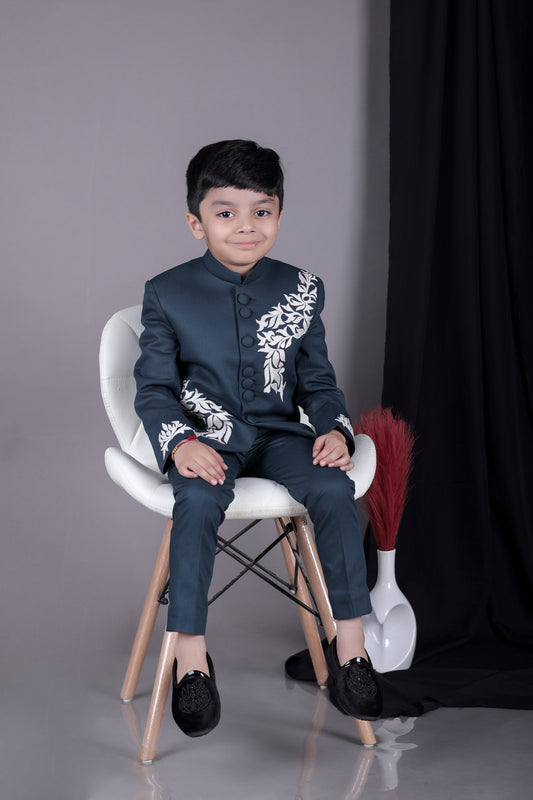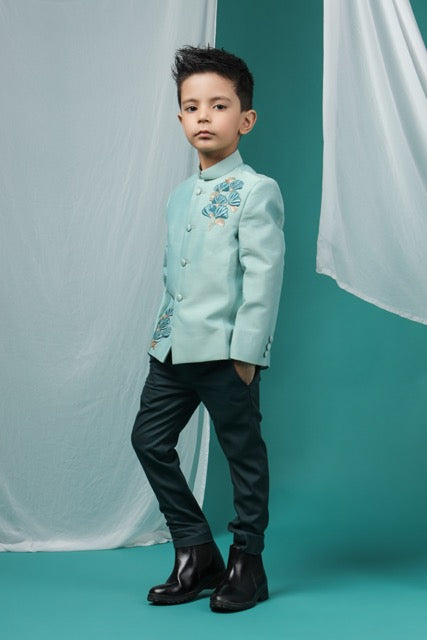 Aqua Green Prince Coat With Flower Embroidery With Pant Set