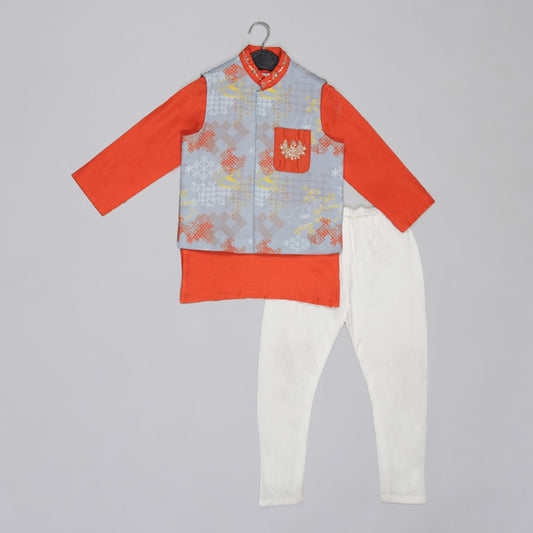 Orange Kurta With Grey Geometrical Printed Bundi Jacket With Hand Embroidery With Pajama Set