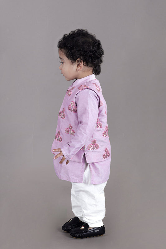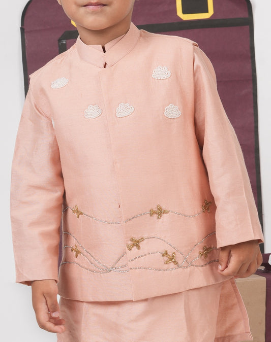 Onion Pink Kurta With Aeroplane/Clouds Hand Embroidered Bundi Jacket With Pajama Set