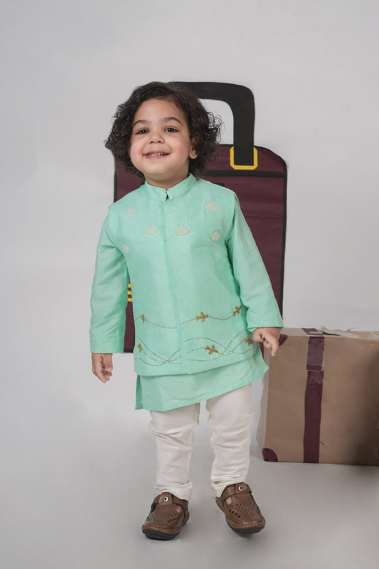 Mint Green Kurta With Aeroplane/Clouds Hand Embroidered Bundi Jacket With Pajama Set