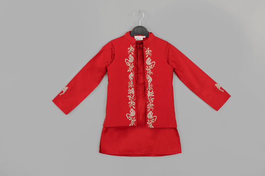 Red Kurta With Beidge Geometrical Printed Bundi Jacket With Hand Embroidery With Pajama Set