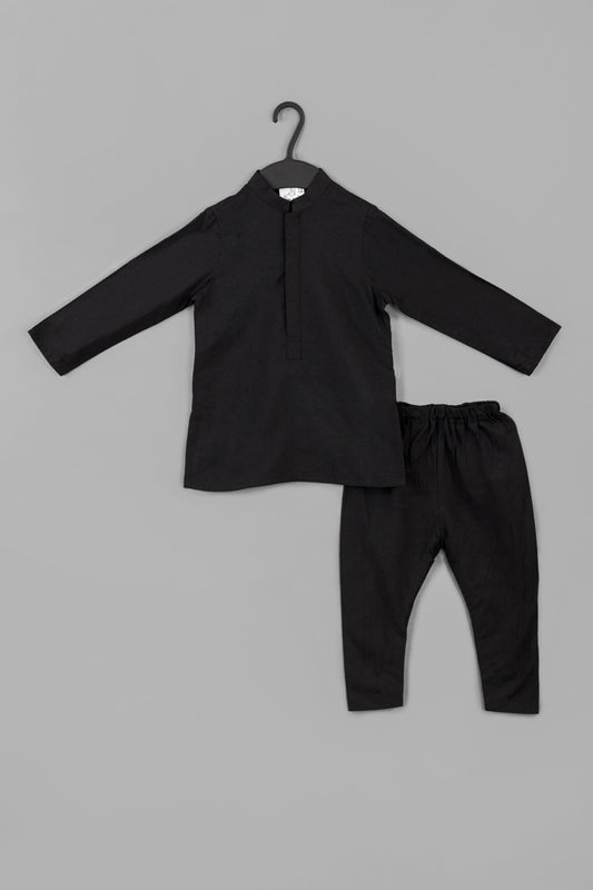 Black Kurta With Black Flower Printed Bundi Jacket With Pajama Set