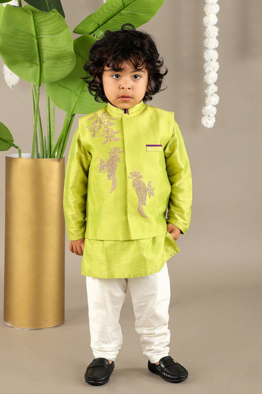 Parrot Green Kurta With Bird Cord Embroidery Bandhgala With Bottom Set