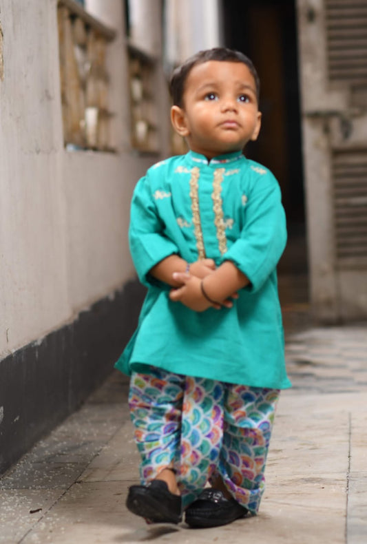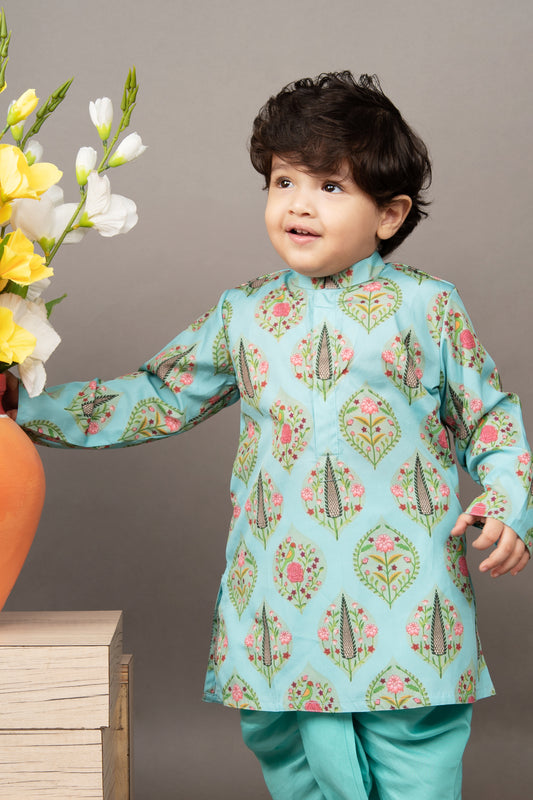 Aqua Blue Traditional Printed Kurta With Dhoti Set