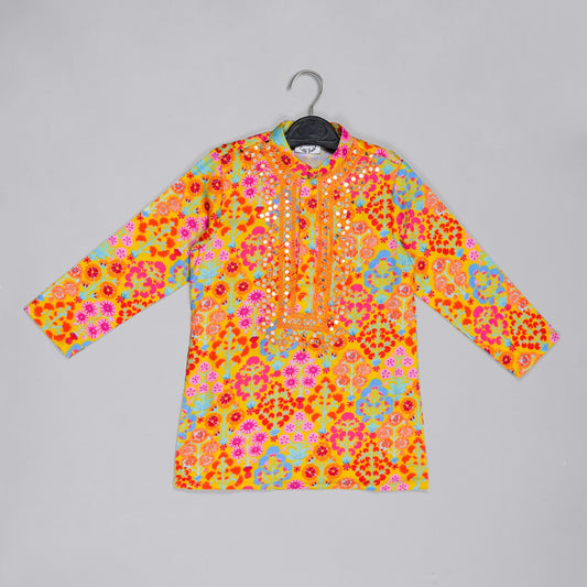 Mustard Floral Printed Mirror Work And Embroidery Kurta With Dhoti Set