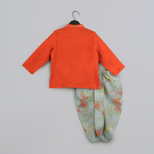 Orange Hand Embroidered Kurta With Grey Geometrical Printed Dhoti Set
