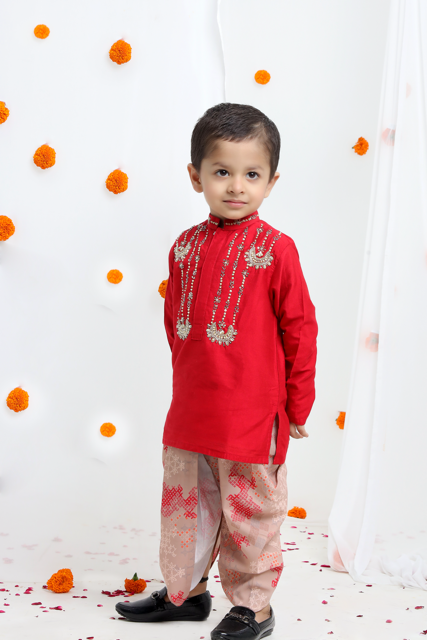 Red Embroidered Asysmrtrical Kurta With Printed Dhoti For Krishna Dress