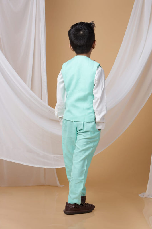 White Shirt/Mint Green Travel Theme Hand Embroidery Waist Coat/Pant/Bow Tie Set