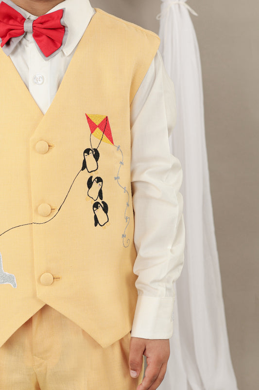 Yellow Bear And Penguin Waist Coat/Shirt/Pant/Bow Tie Set
