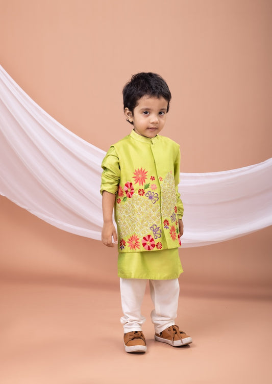 Parrot Green Kurta With Mix Heavy Embroidered Bundi Jacket With Pajama Set