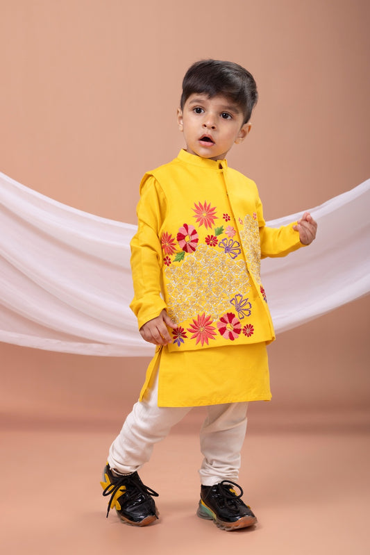 Yellow Kurta With Mix Heavy Embroidered Bundi Jacket With Pajama Set