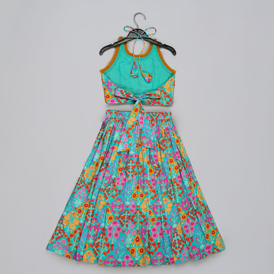 Blue Floral Printed Mirror Work And Embroidery Blouse With Floral Printed Ghagara Set