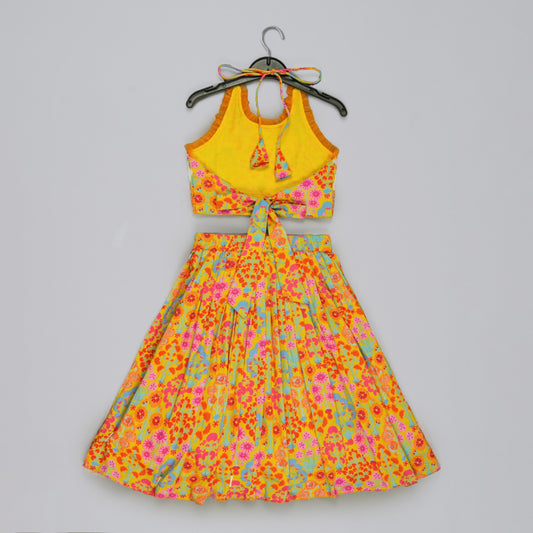 Mustard Floral Printed Mirror Work And Embroidery Blouse With Floral Printed Ghagara Set