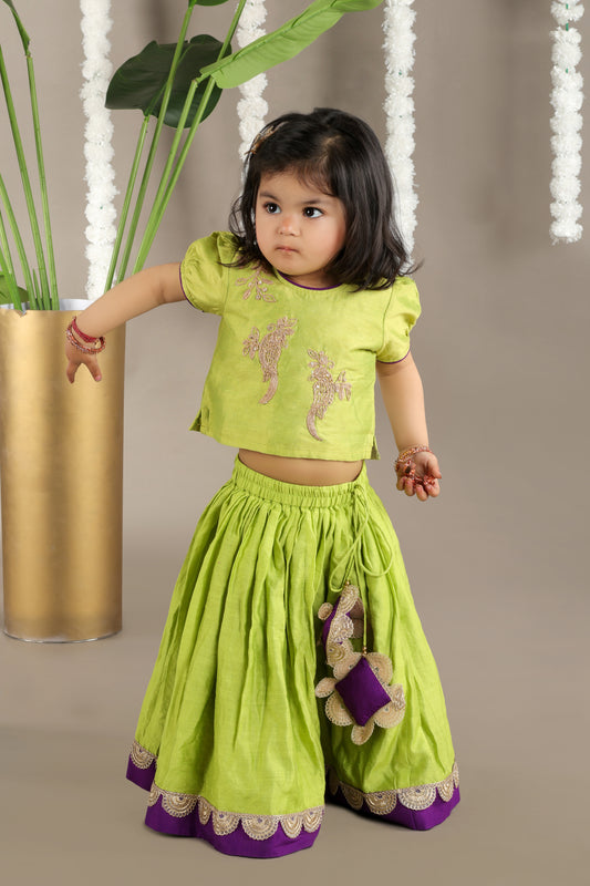 Parrot Green Ghagara With Bird Cord Embroidery Blouse Set