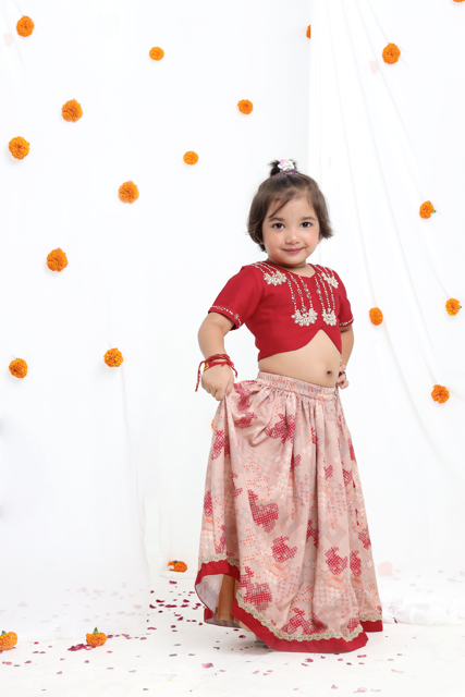 Redish Hand Embroidered Blouse With Beidge Geometrical Printed Ghagara Set