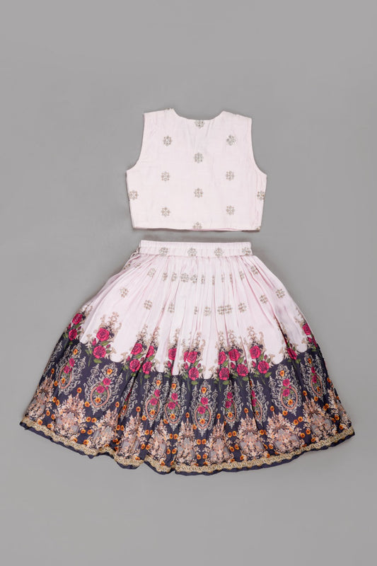 Powder Pink Zari Embroidered Blouse With Flower Printed Zari Embroidered Ghagara Set