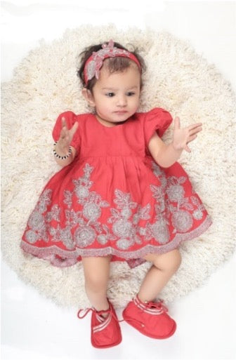 Jamana Girl Red With Flower Embroidery With Pant Set