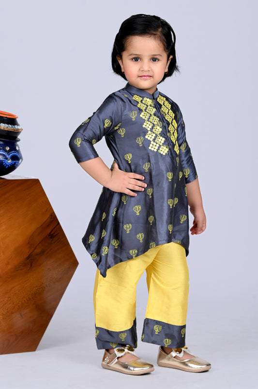 Grey Balloon Printed Assytrimical Kurti With Pant Set