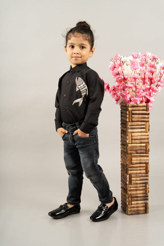 Black Full Shirt With Hand Fish Embrodery