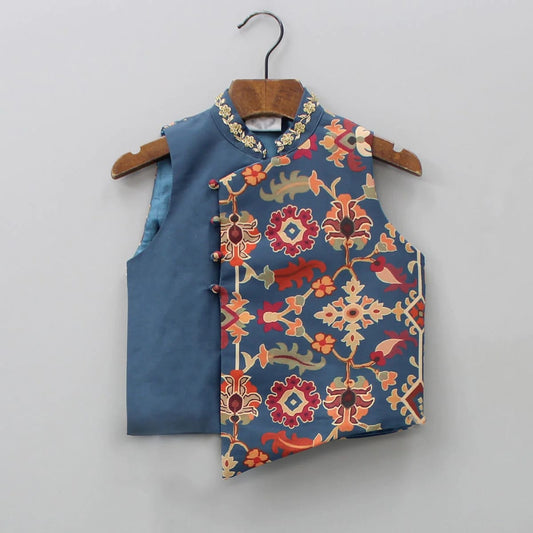 Sapphire Blue Kurta With Ikkat Print Jacket With Hand Embroidered With Churidar Set