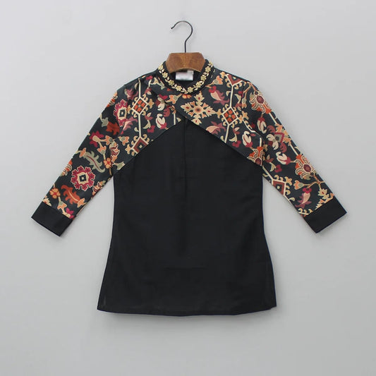Black Kurta With Ikkat Print Jacket With Hand Embroidered With Churidar Set