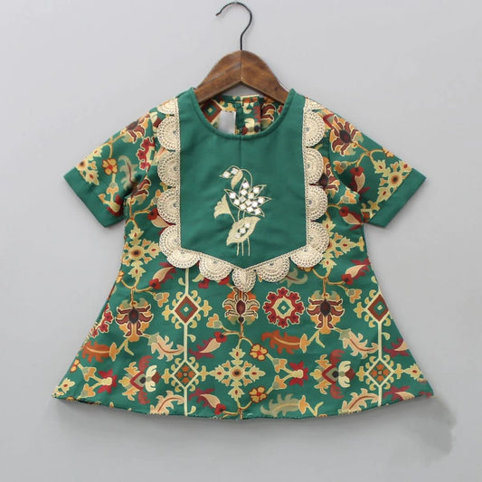 Bottle Green Ikkat Print Embroidered Kurti With Dhoti Pant Set