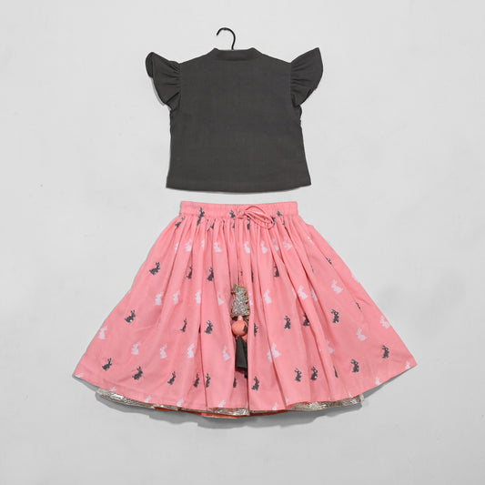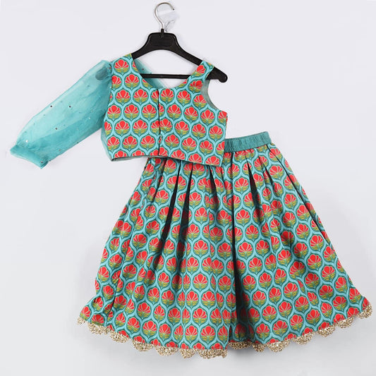 Aqua Green Printed Blouse/ Pan Embroidered Collar And Asyamartrical Peach Ghagara With Printed Belt