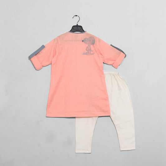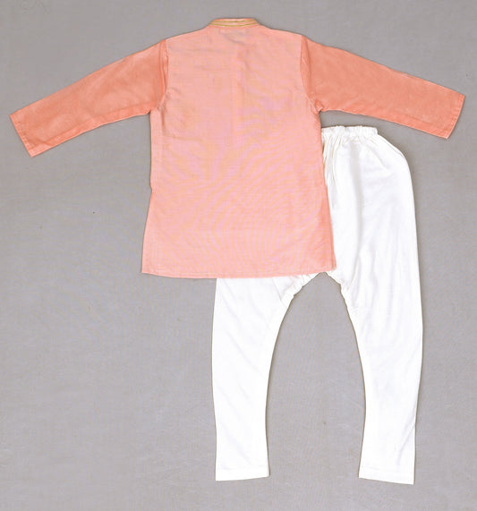 Peach Kurta With Green Gold Printed Attached Jacket Set