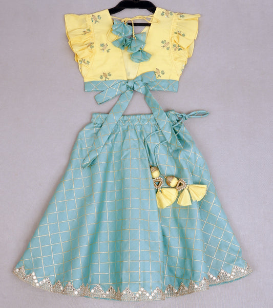 Honey Bee Print With Hand Embroidery Yellow Blouse With Foil Print Aqua Blue Ghagara