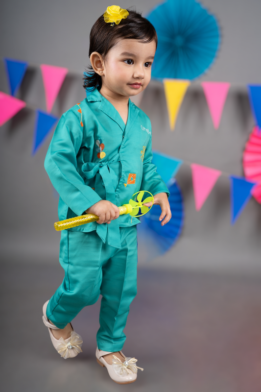 Peacock Green Kurta With Embroidered Open Jacket With Hand With Bottom Set