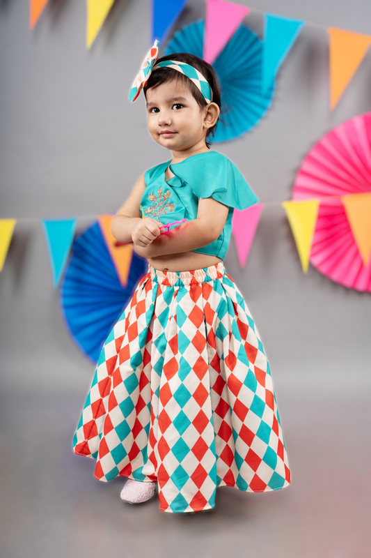 Carnival Diamonds Printed Skirt With Hand Embroidered Green Top Set