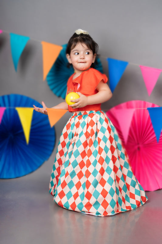 Carnival Diamonds Printed Skirt With Hand Embroidered Red Top Set