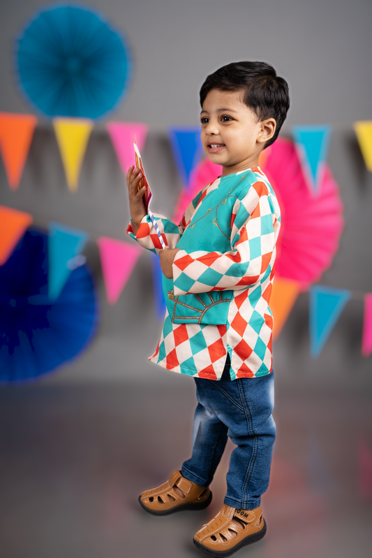 Carnival Circus Printed Kurta With Attached Embroidered Red Flap Jacket With Pajama Set