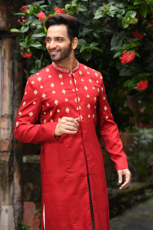 Maroon Sherwani With Zardosi Hand Embroidered Boota With Churidar Set