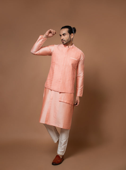Pink Layer Stylish Kurta With Heavy Pintux And Emrphoidered Bundi Pajama Set