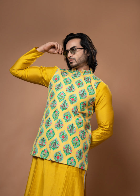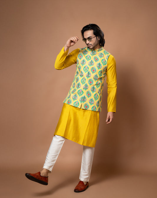Mustard Yellow Kurta With Applique Work With Zardosi Traditinal Printed Bundi With Pajamna Set