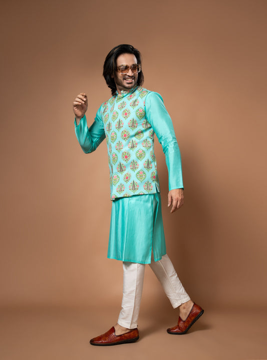 Aqua Blue Kurta With Applique Work With Zardosi Traditinal Printed Bundi With Pajamna Set