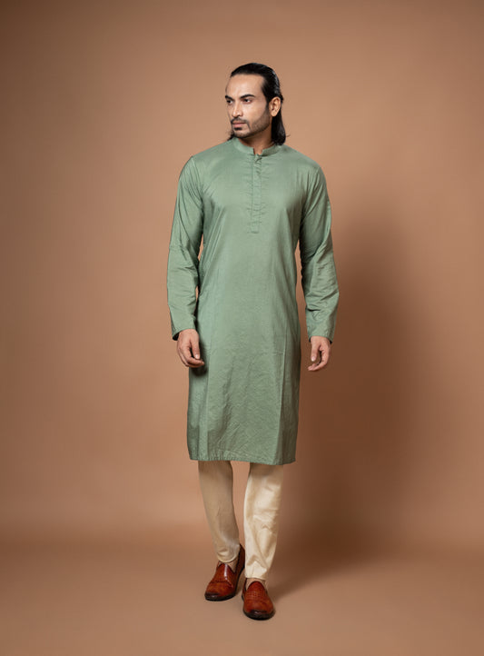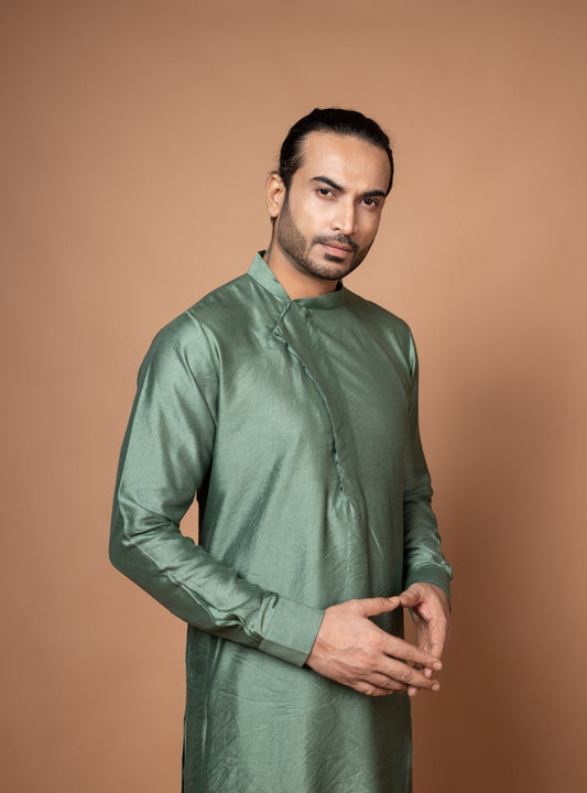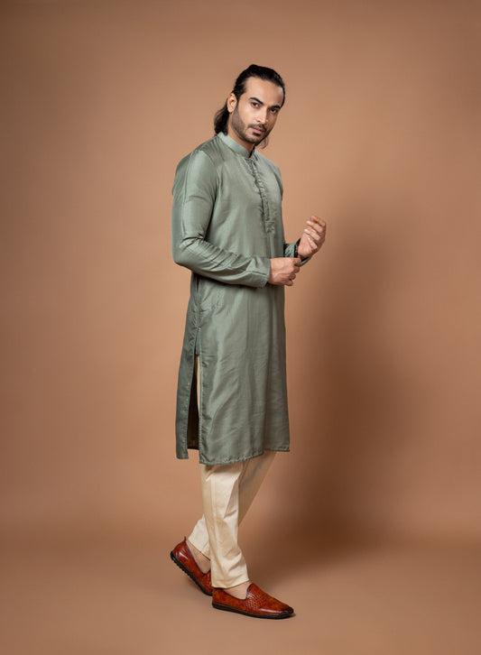 Olive Green Plain Kurta With Quirku Embroidery Bundi Pajamna Set