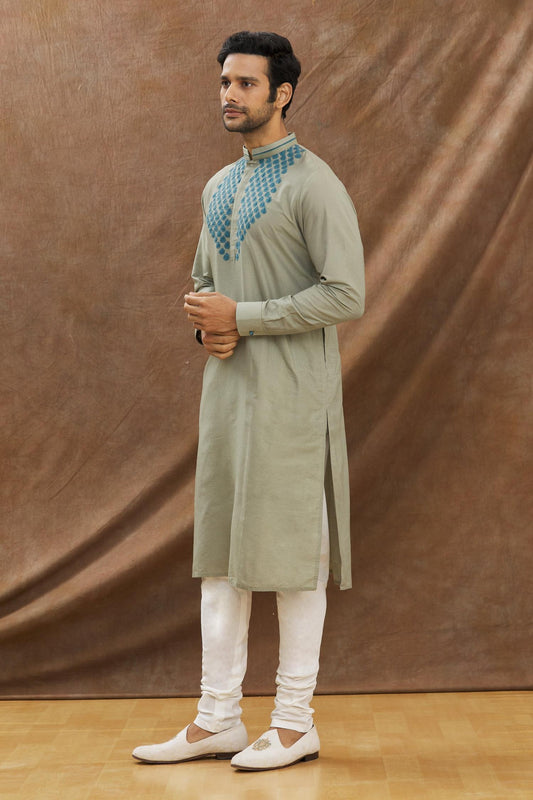 Grey Kurta With Applique Work On The Yoke With Churidar Set