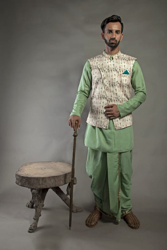 Green Printed Kurta With Hand Embroidered Nehru Jacket With Pant