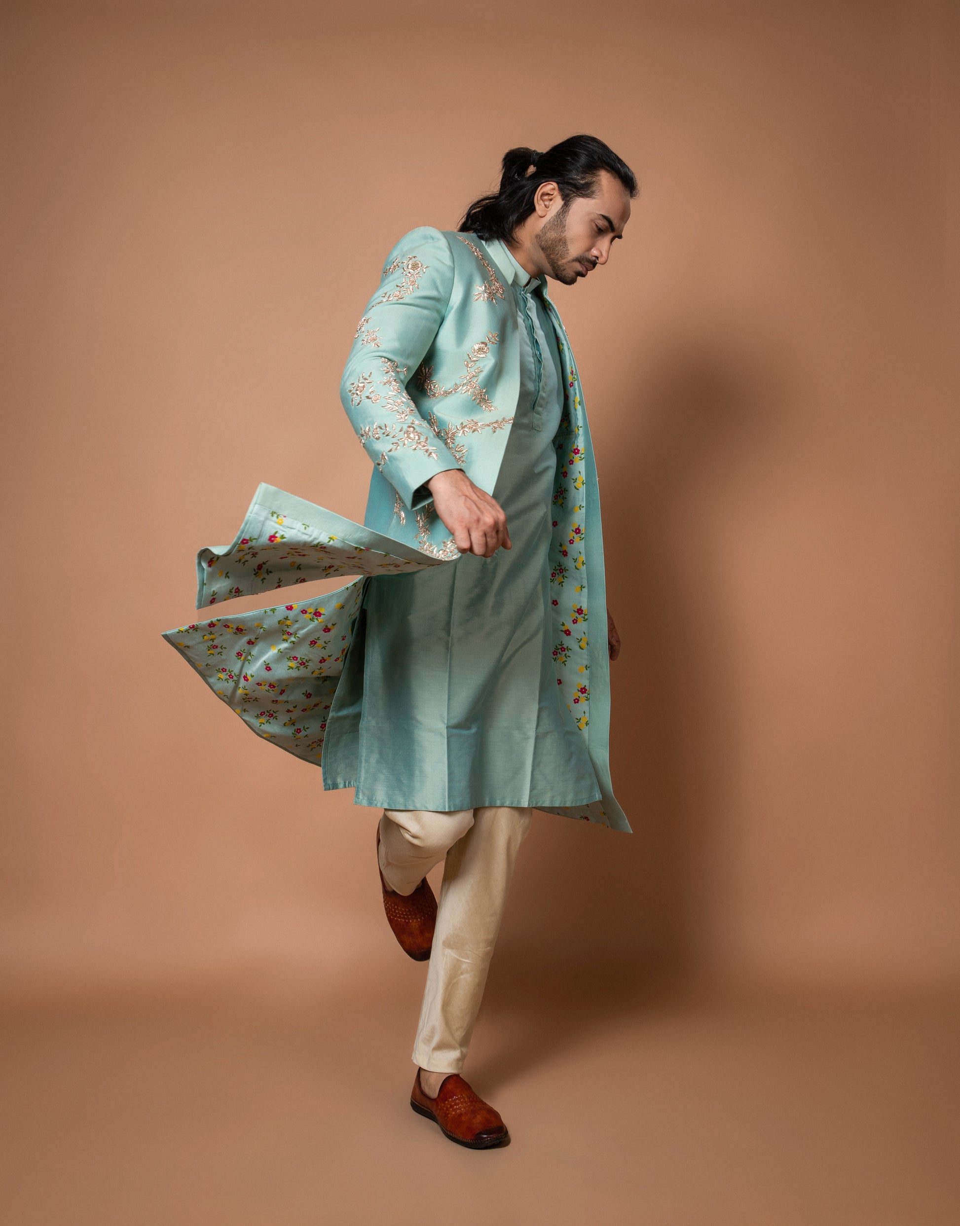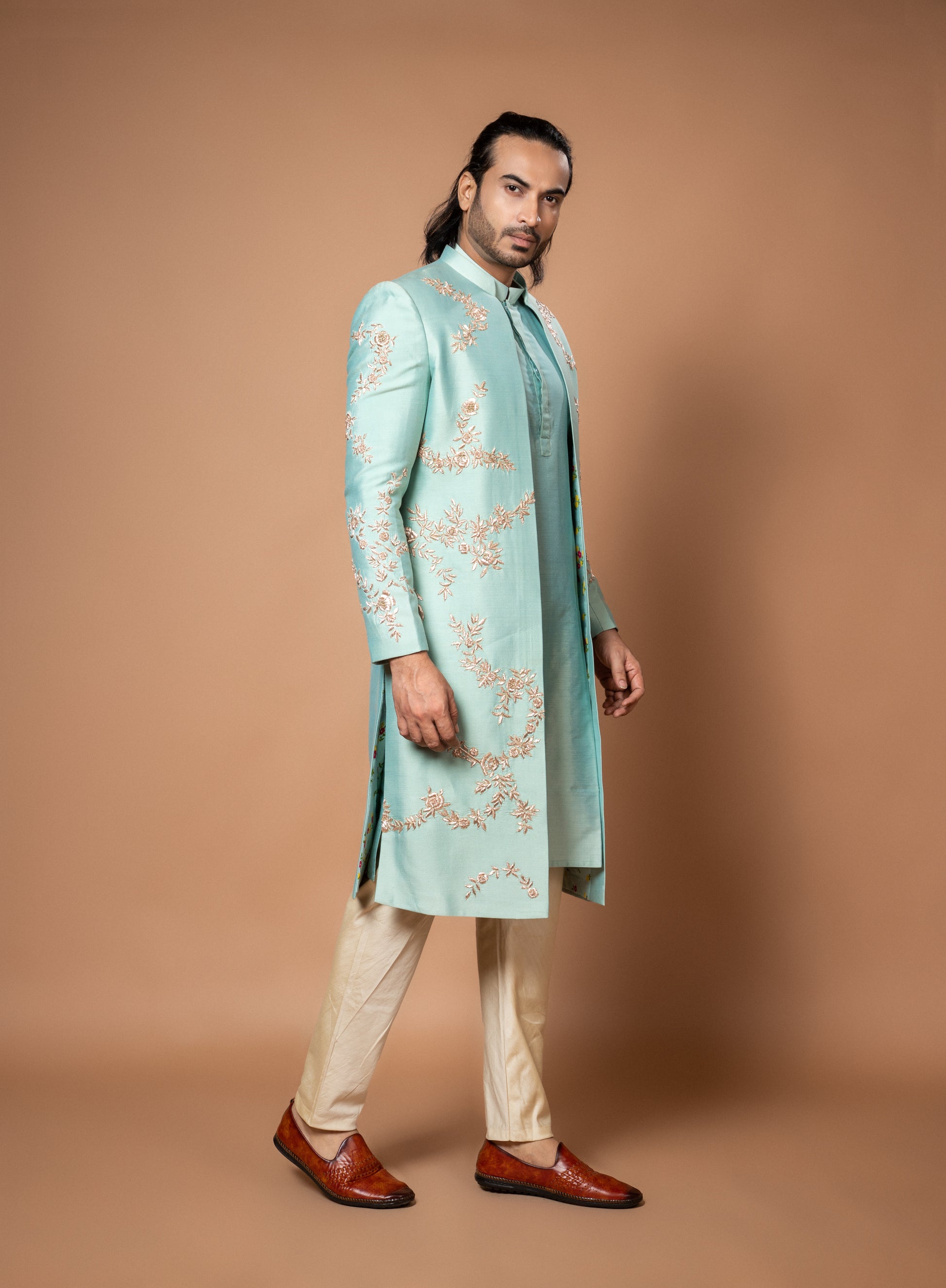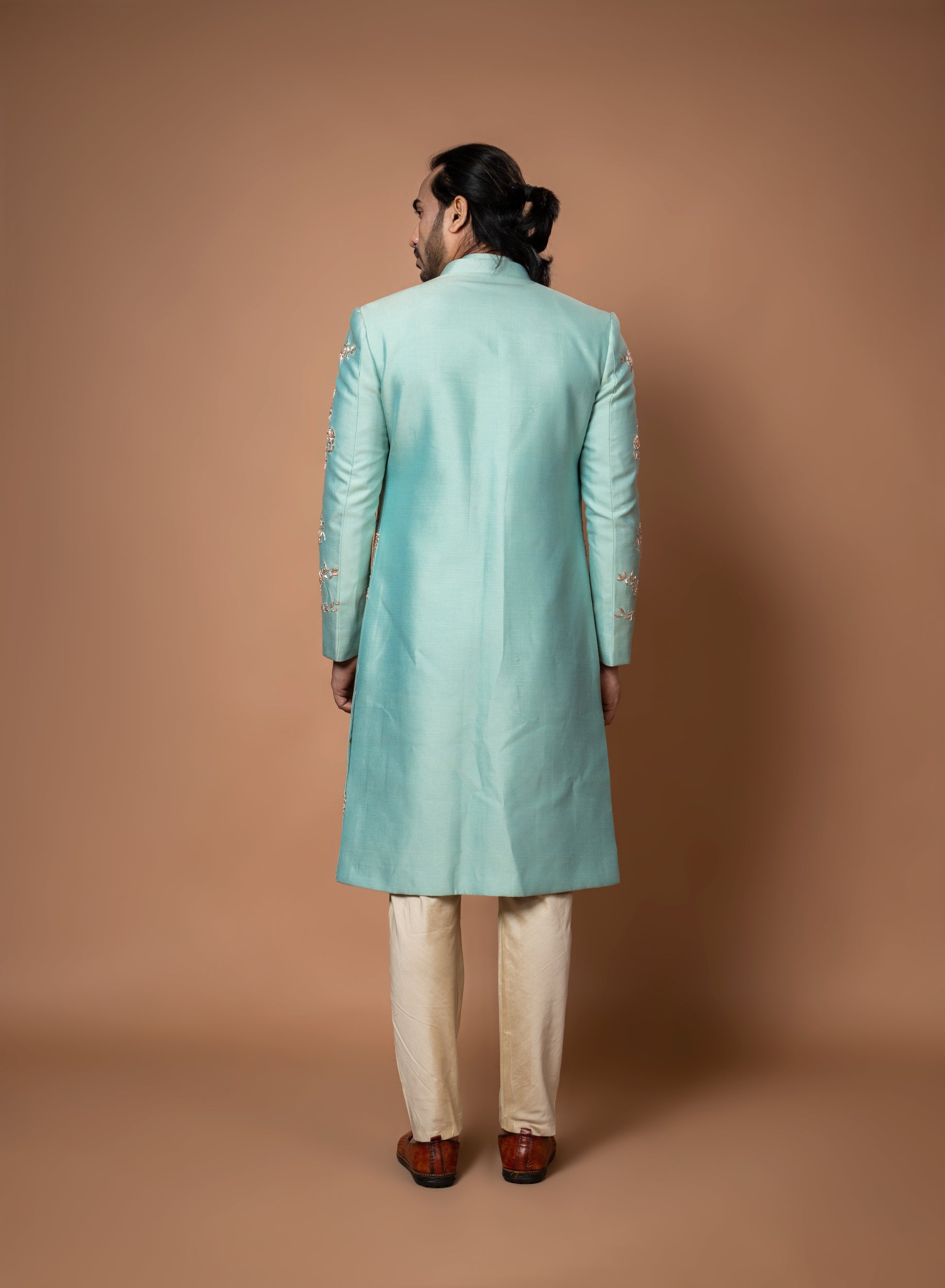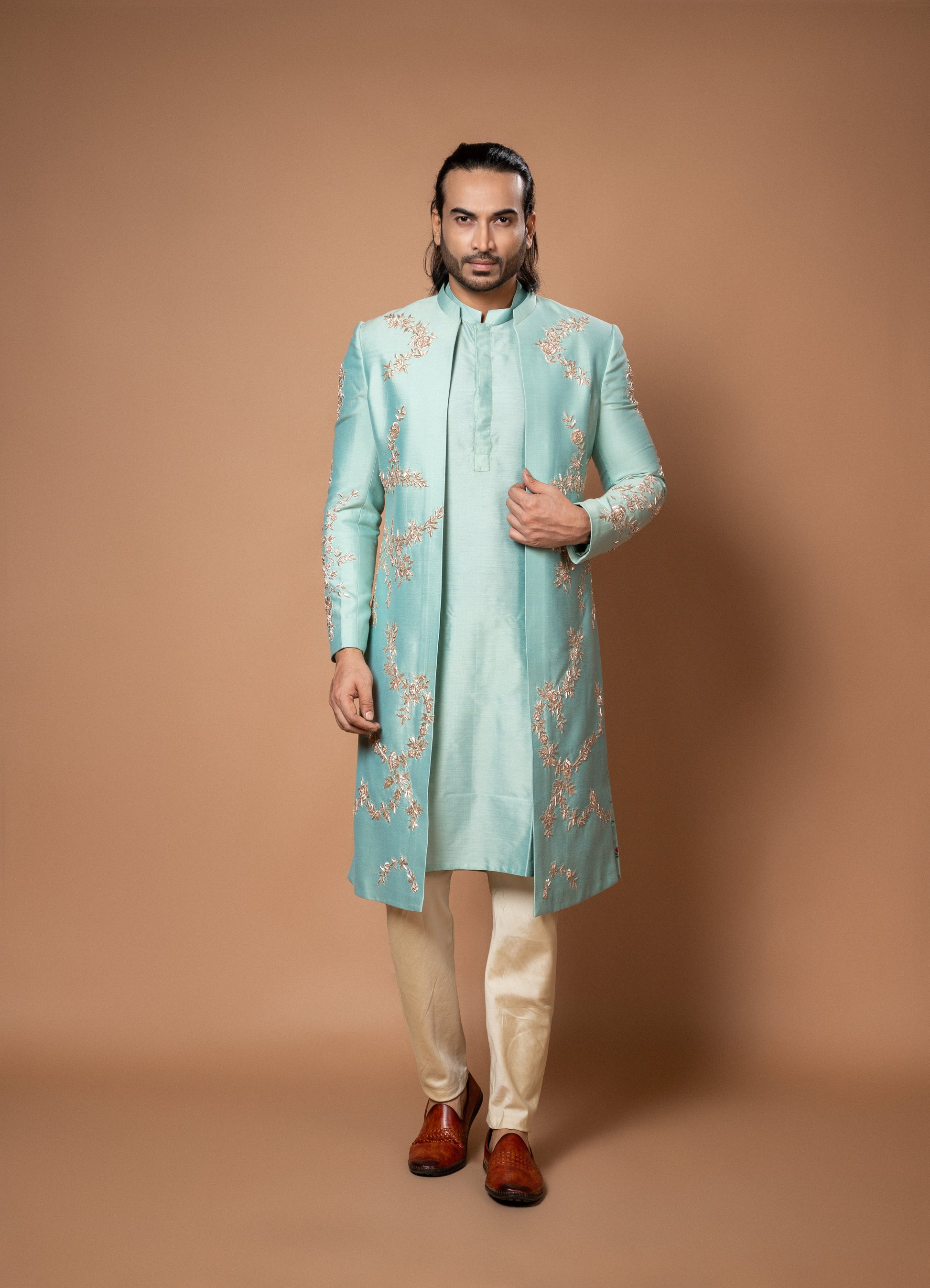 Aqua Blue Very Heavy Zardosi And Maal Hand Embroidery Sherwani With Kurta And Pajama Set