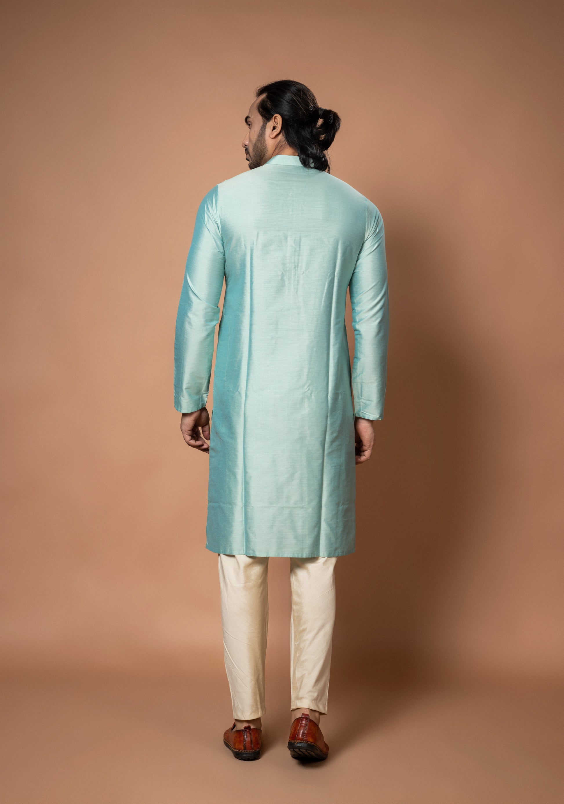 AQUA BLUE PLAIN KURTA, VERY HEAVY ZARDOSI AND MAAL HAND EMBROIDERED IN FRONT BOTH HAND IN SHERWANI, BEIDGE PAJAMA BOTTOM WITH ELASTIC