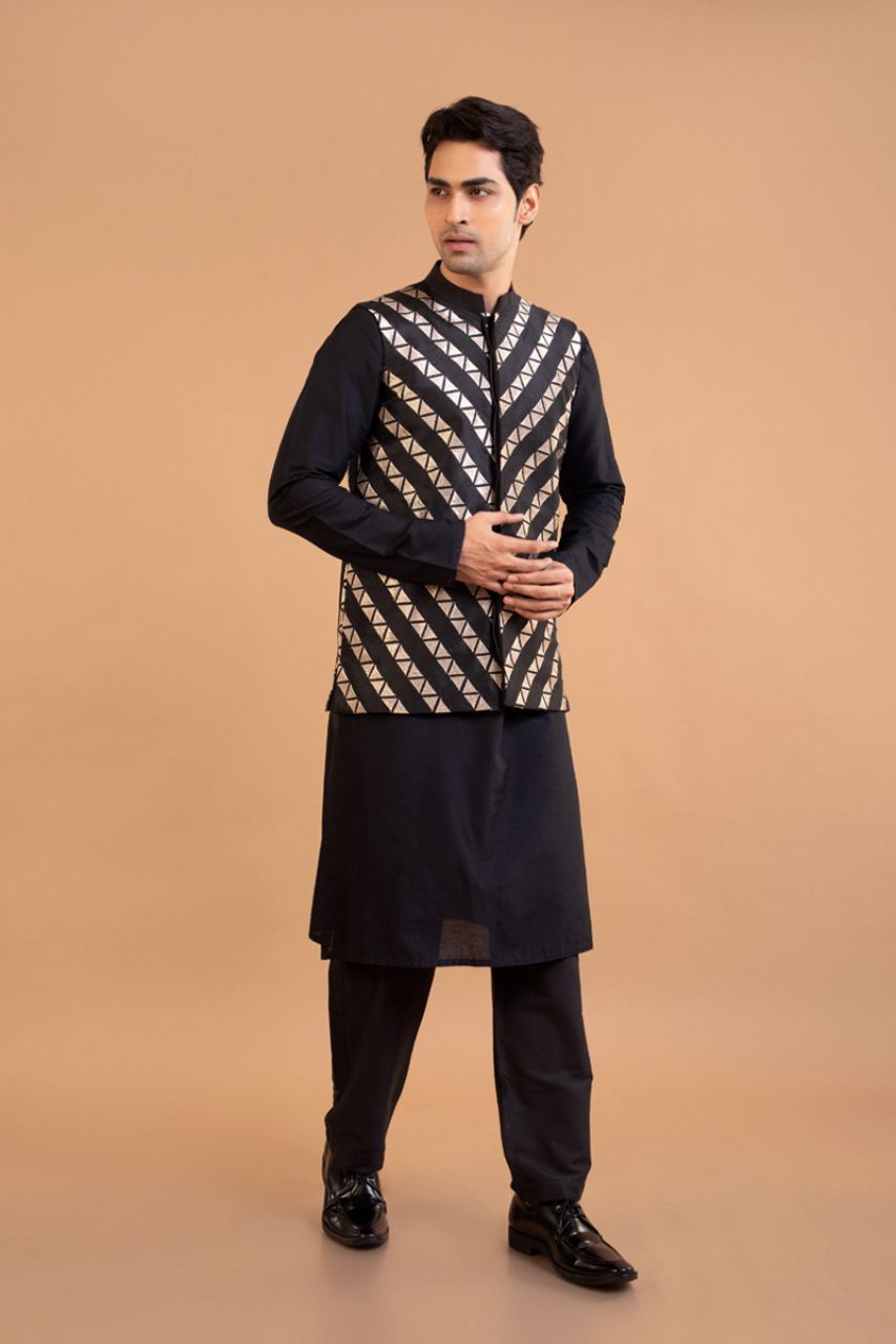 PLAIN BLACK KURTA, HEAVY ZARI EMBROIDERED BUNDI, BLACK PAJAMA BOTTOM