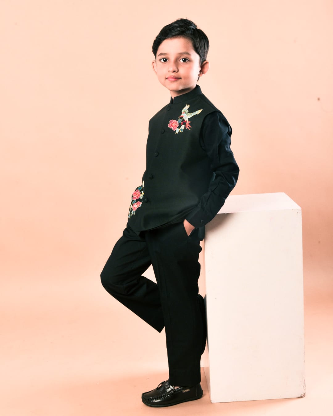 Black Shirt With Colourful Bird And Flower Embroidery Bundi Jacket With Pant Set