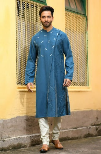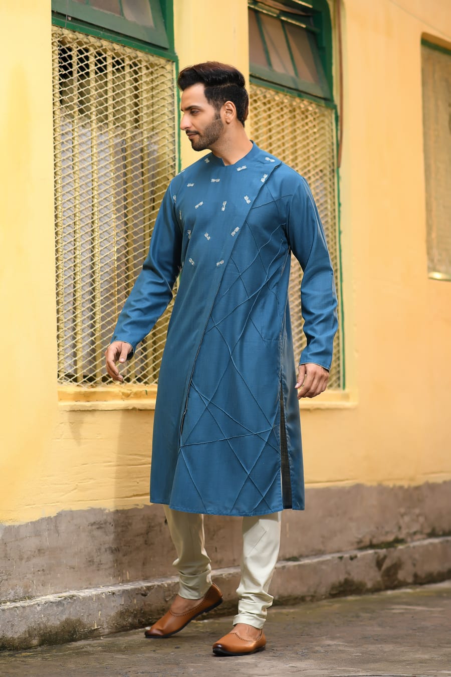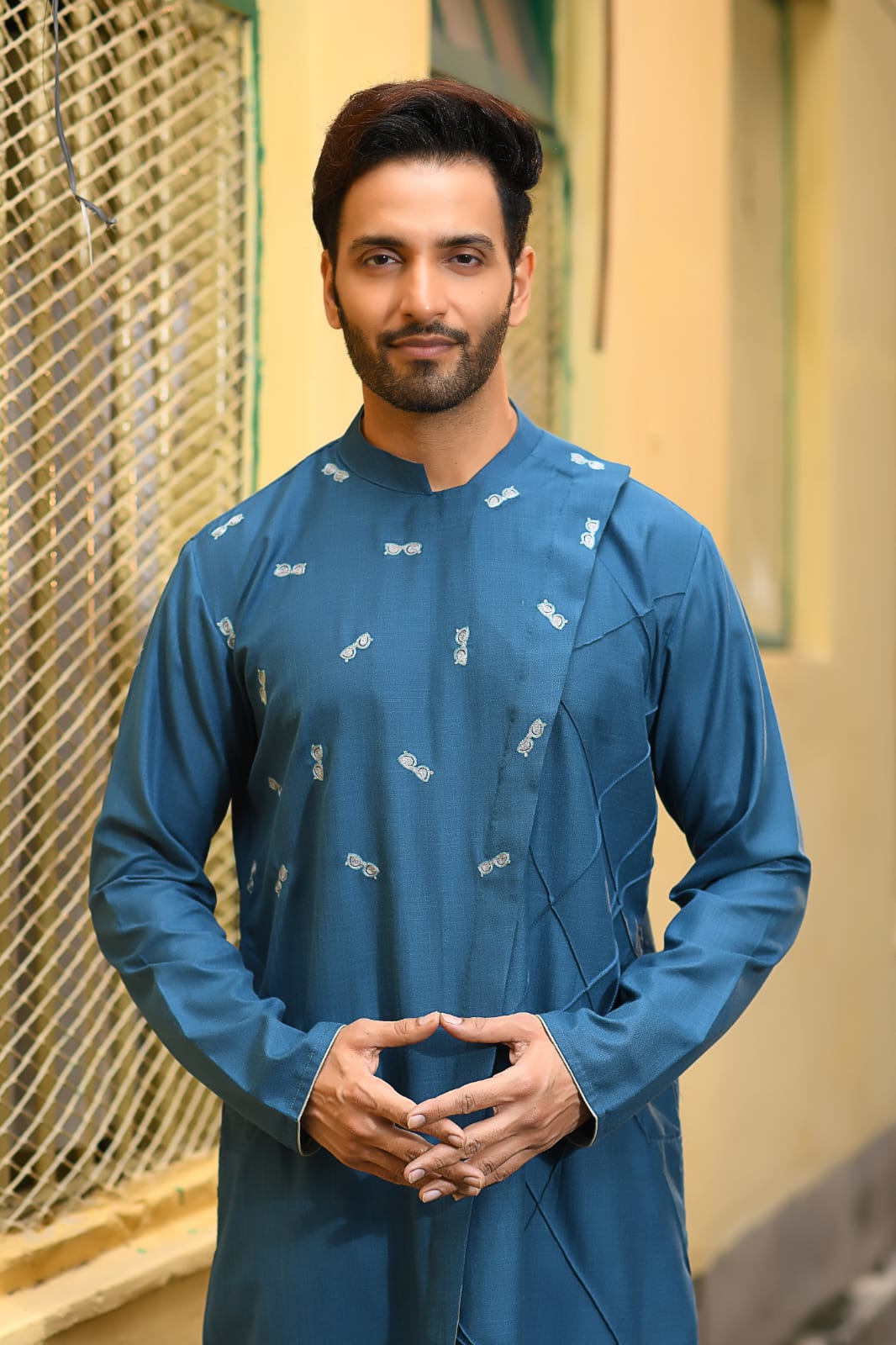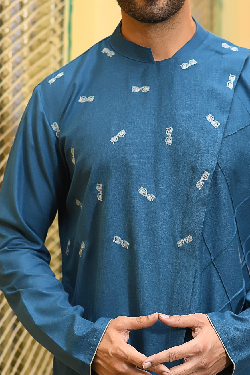 QUIRKY GOGGLES EMBROIDERY ALL OVER KURTA, PINTUX IN ASYMMETRICAL PATTEN SIDE OPEN KURTA, CHURIDAR PAJAMA BOTTOM, DELIVERY 15 DAYS