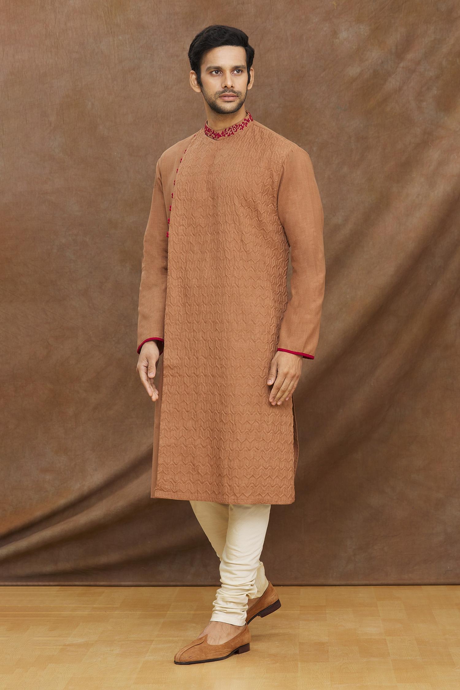 HEAVY SHADOW EMBROIDERY ON THE FRONT ON KURTA, SIDE ANGRAKHA PATTEN KURTA, HAND KNOT EMBROIDERY ON COLLAR, CHURIDAR BOTTOM