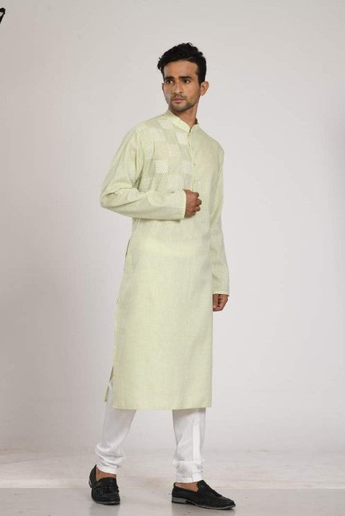 Cotton Khadi Kurta With Box Embroidery On The Yoke With Churidar