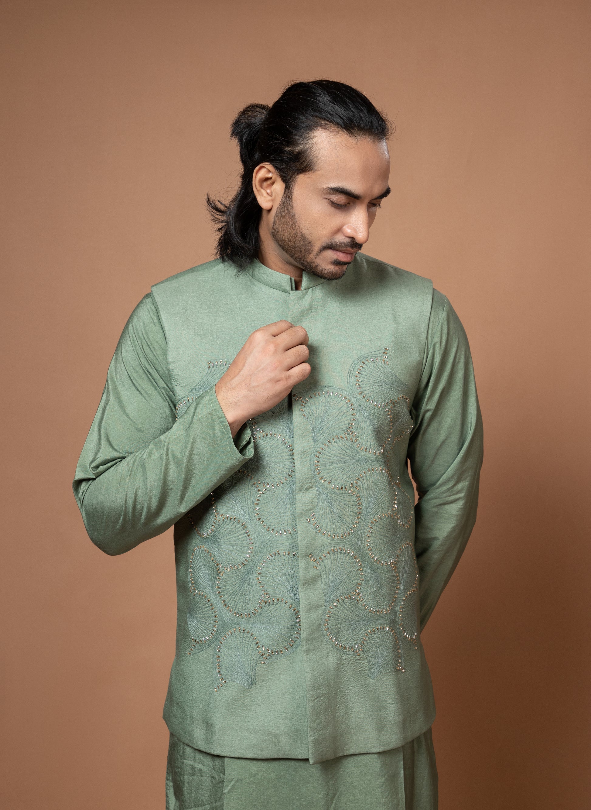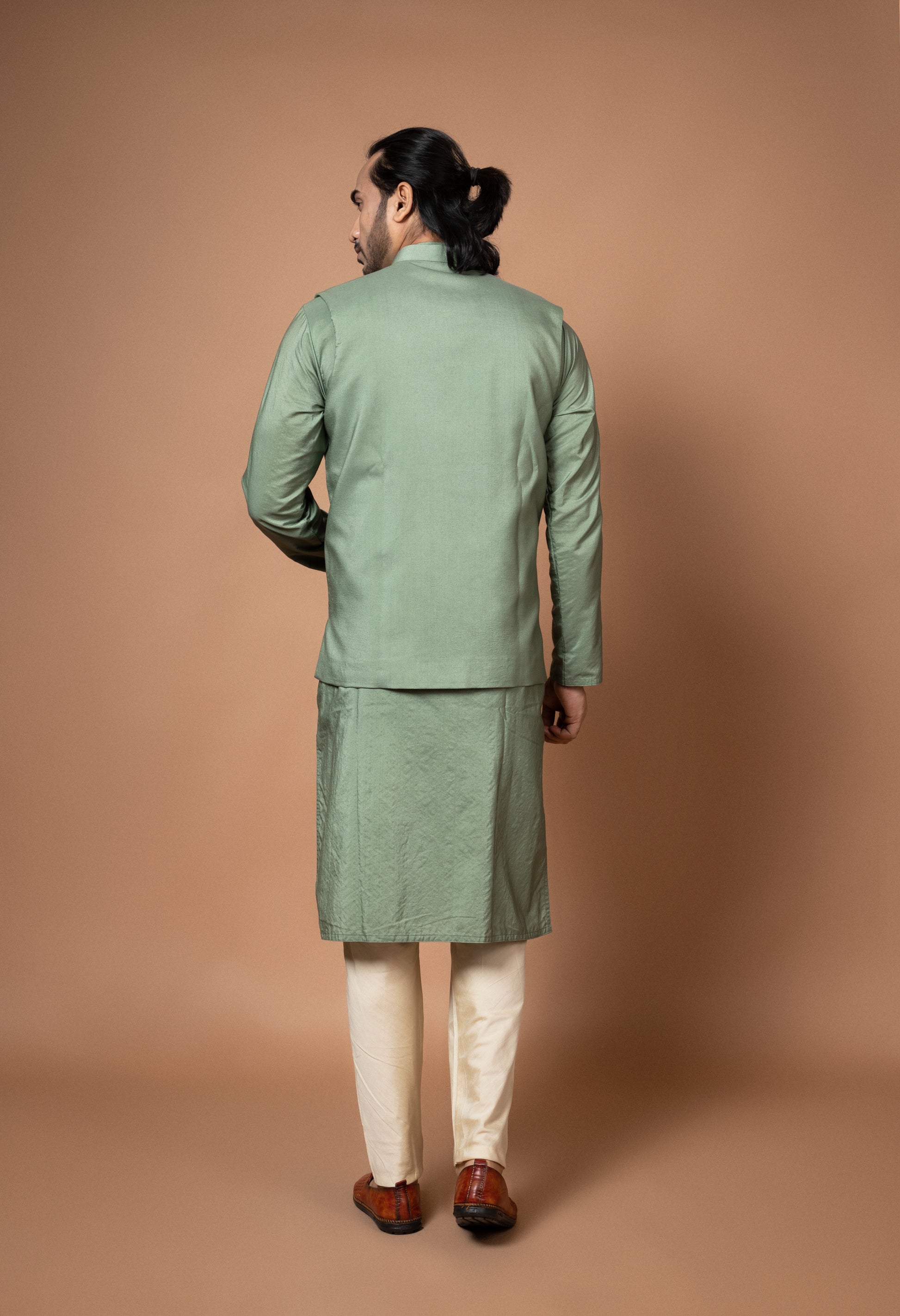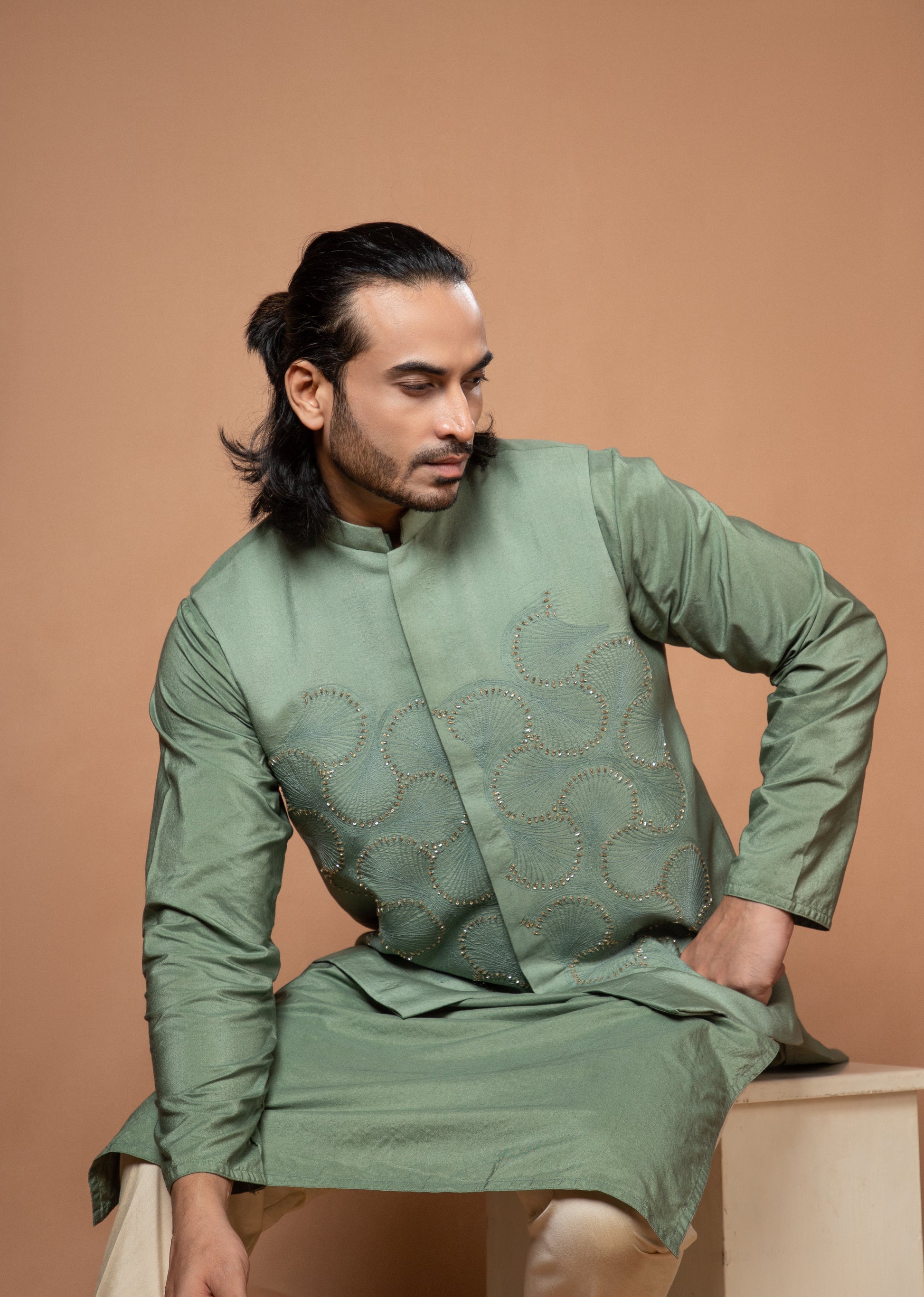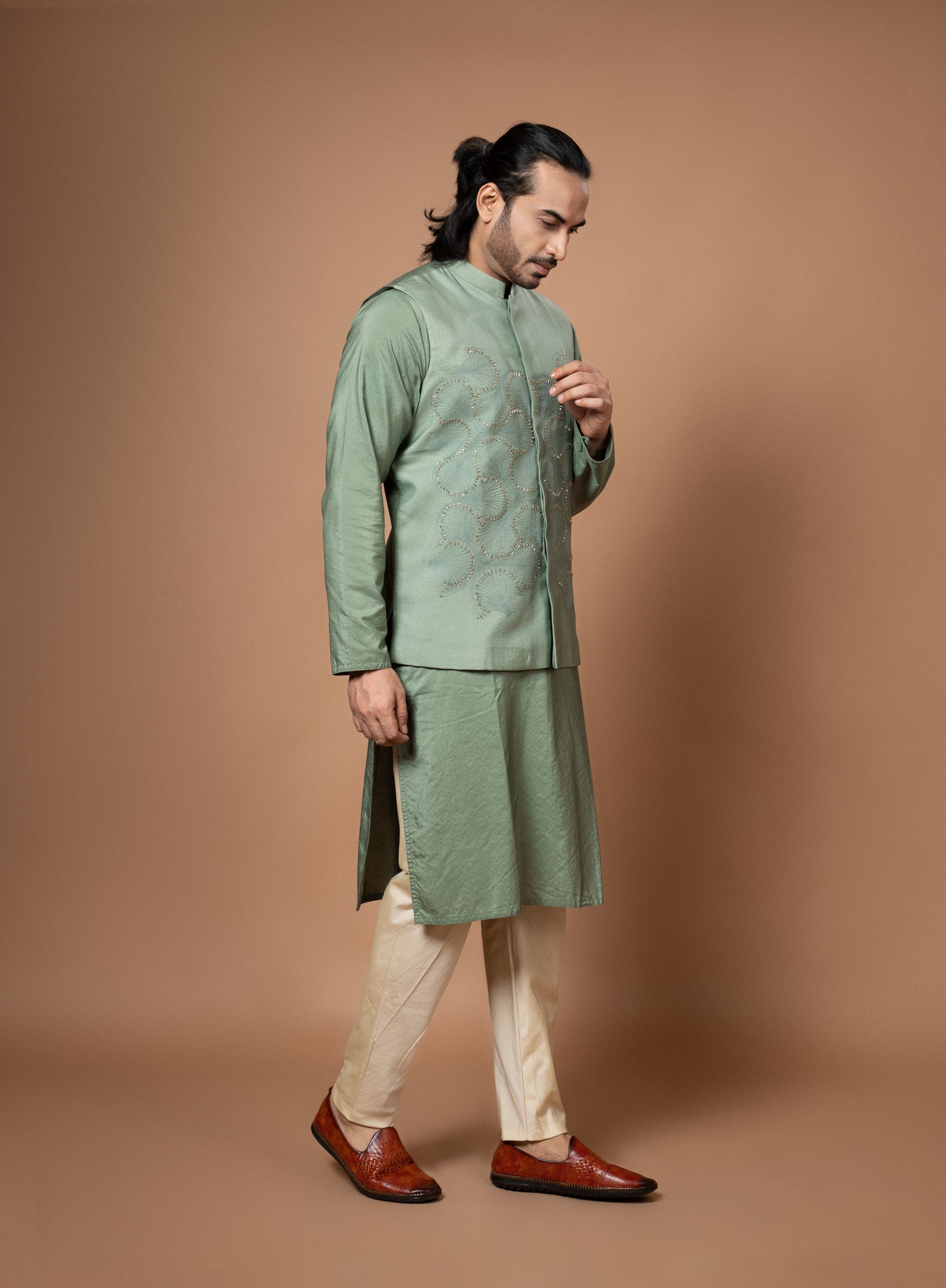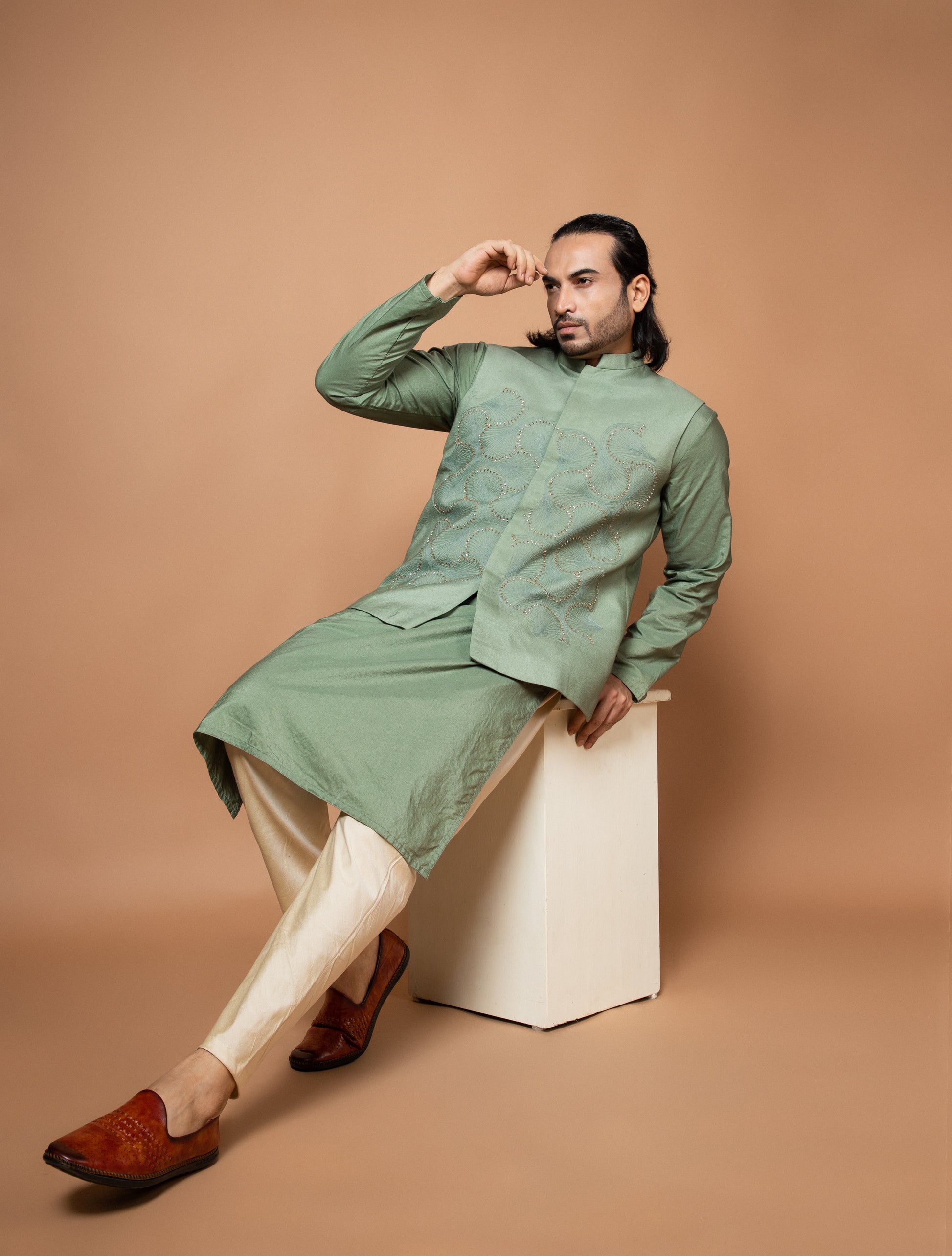 OLIVE GREEN PLAIN KURTA, QUIRKY DESIGN WITH CORD AND HAND EMBRODERY ON FRONT BUNDI, PAJAMA WITH ELASTIC BOTTOM