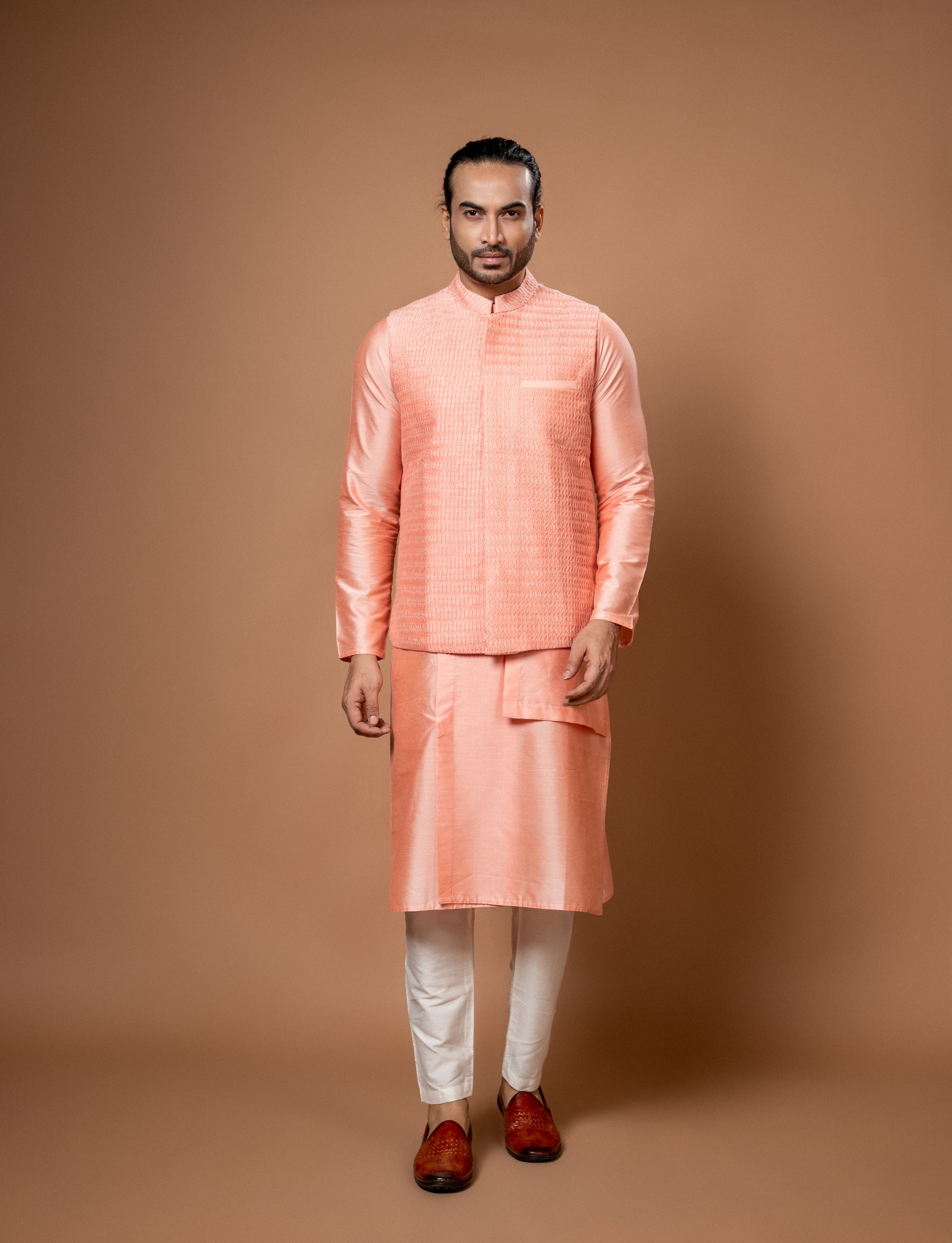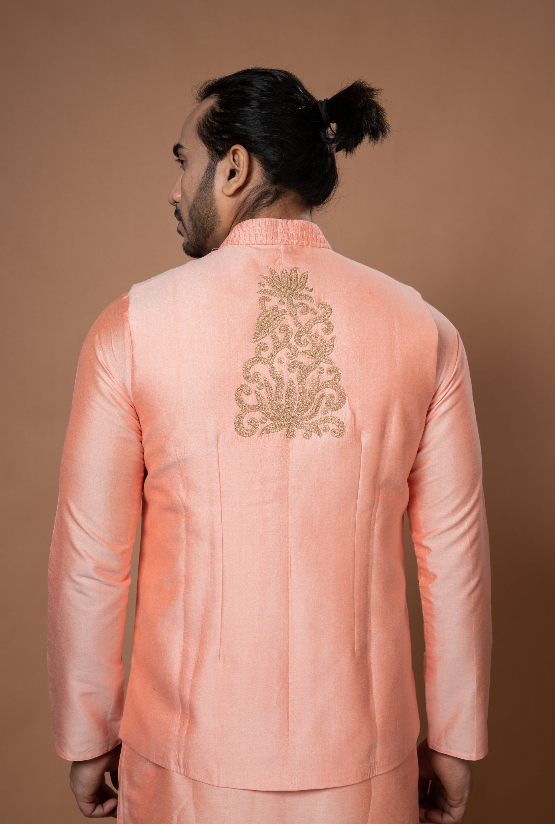 Pink Layer Stylish Kurta With Heavy Pintux And Emrphoidered Bundi Pajama Set